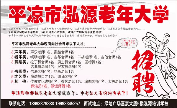 2018-03-27“一年之計(jì)在于春”,在這個(gè)陽(yáng)光明媚,桃花盛開(kāi)的季節(jié)里,經(jīng)過(guò)培訓(xùn)學(xué)校全體工作人員不懈努力,由平?jīng)龉I(yè)園區(qū)泓源職業(yè)培訓(xùn)學(xué)校出資設(shè)立的平?jīng)鍪秀蠢夏攴?wù)中心(社區(qū)老年大學(xué))終于成立了!目前平?jīng)鍪秀蠢夏攴?wù)中心(社區(qū)老年大學(xué))已經(jīng)取得相關(guān)資質(zhì)證件,正在進(jìn)行